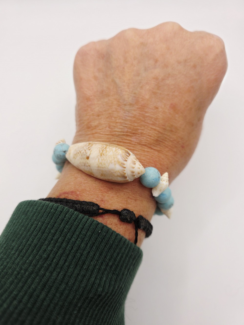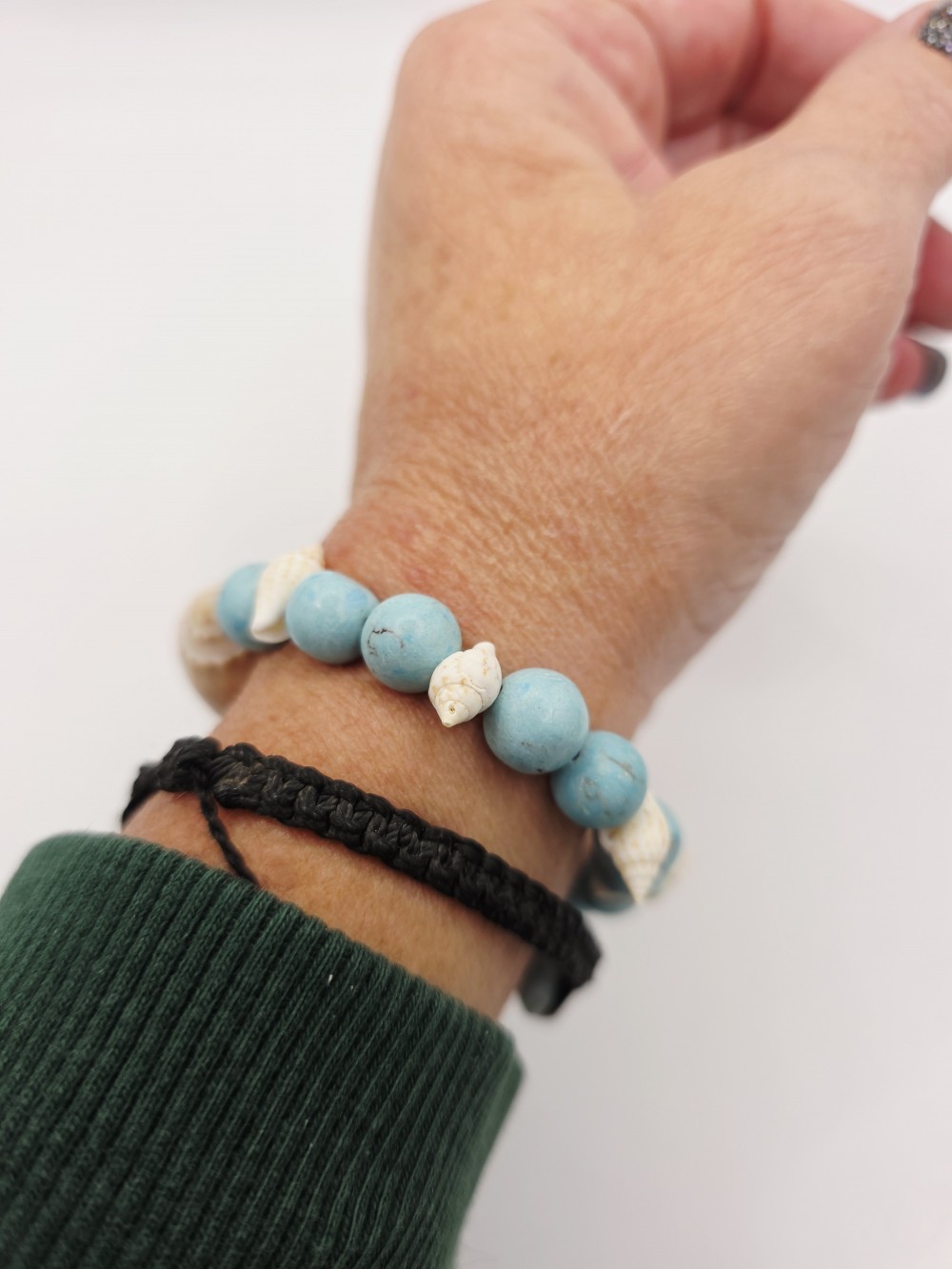 Genuine Florida olive with turquoise agate beads and small seashells. 6 inch heavy duty stretch clear cord. Custom orders available