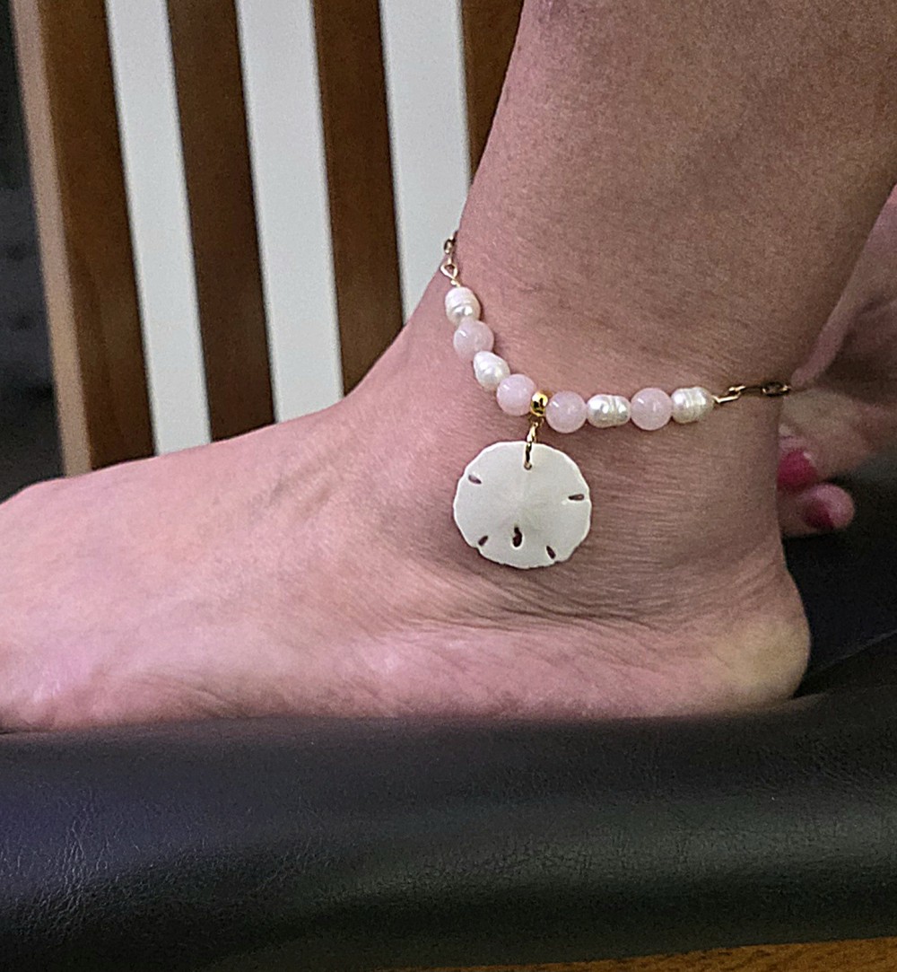 Genuine freshwater pearl with rose quartz sand dollar anklet. Gold stainless steel chain adjusts to 10 inch. Sand dollar encased in uv resin for durability.