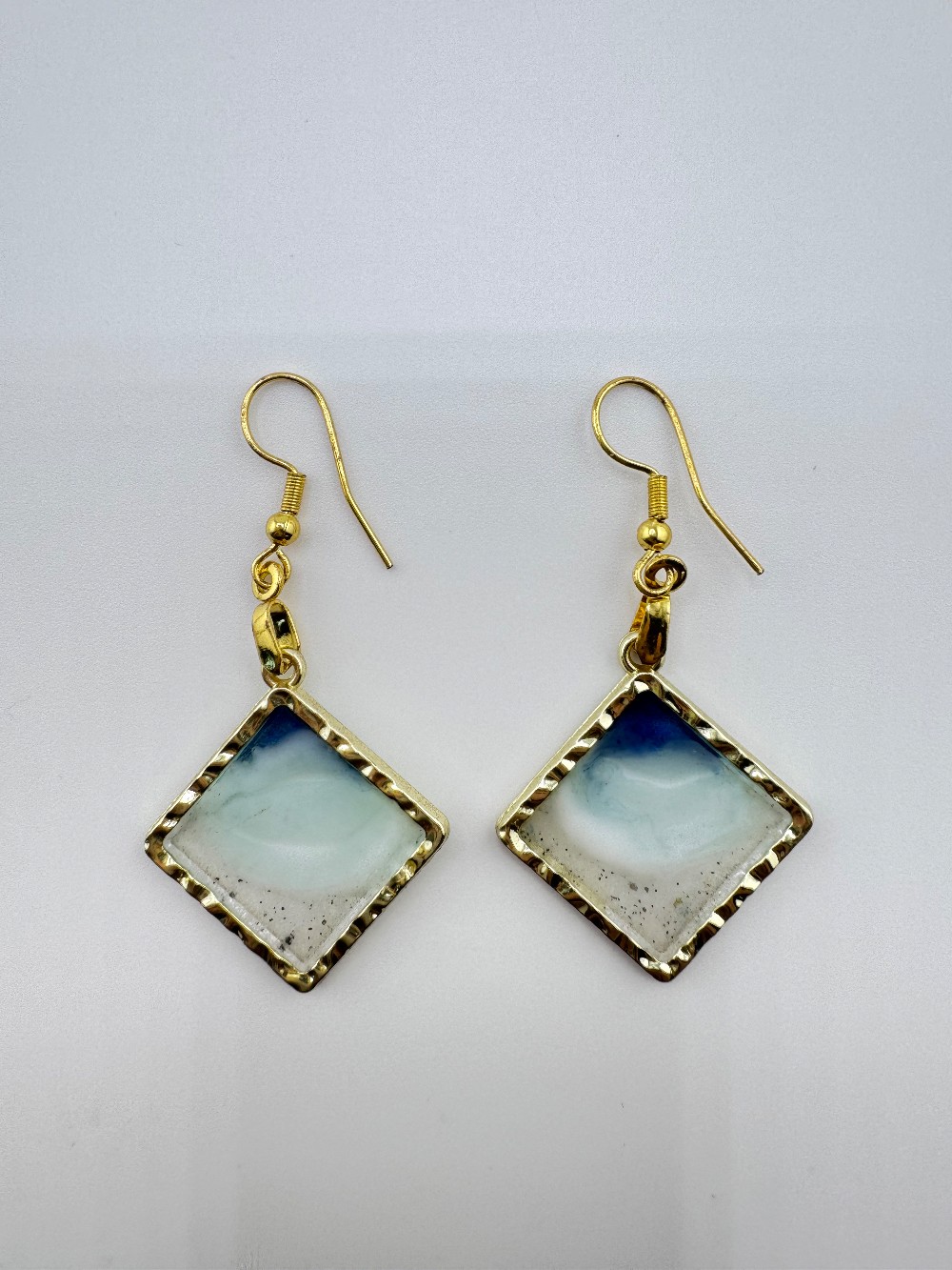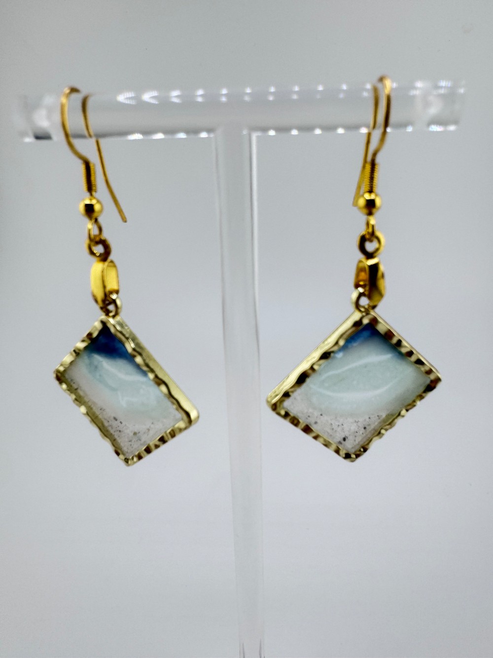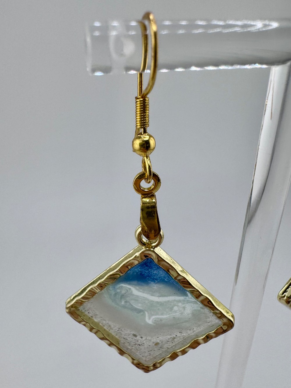 2" x 1" diamond shaped resin shoreline earrings with gold toned bezel and hooks and real AMI sand
