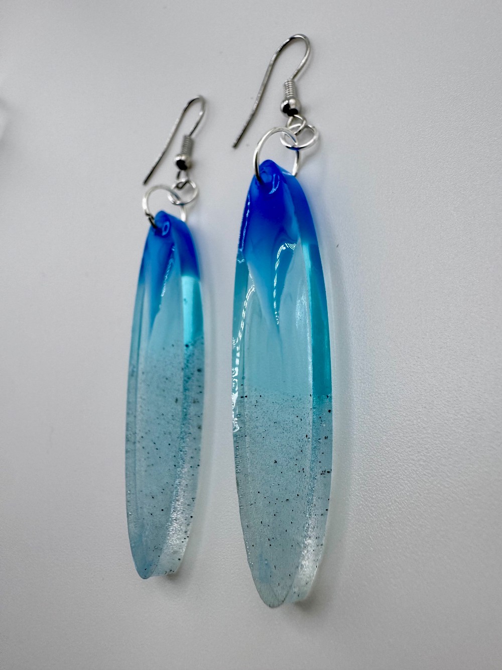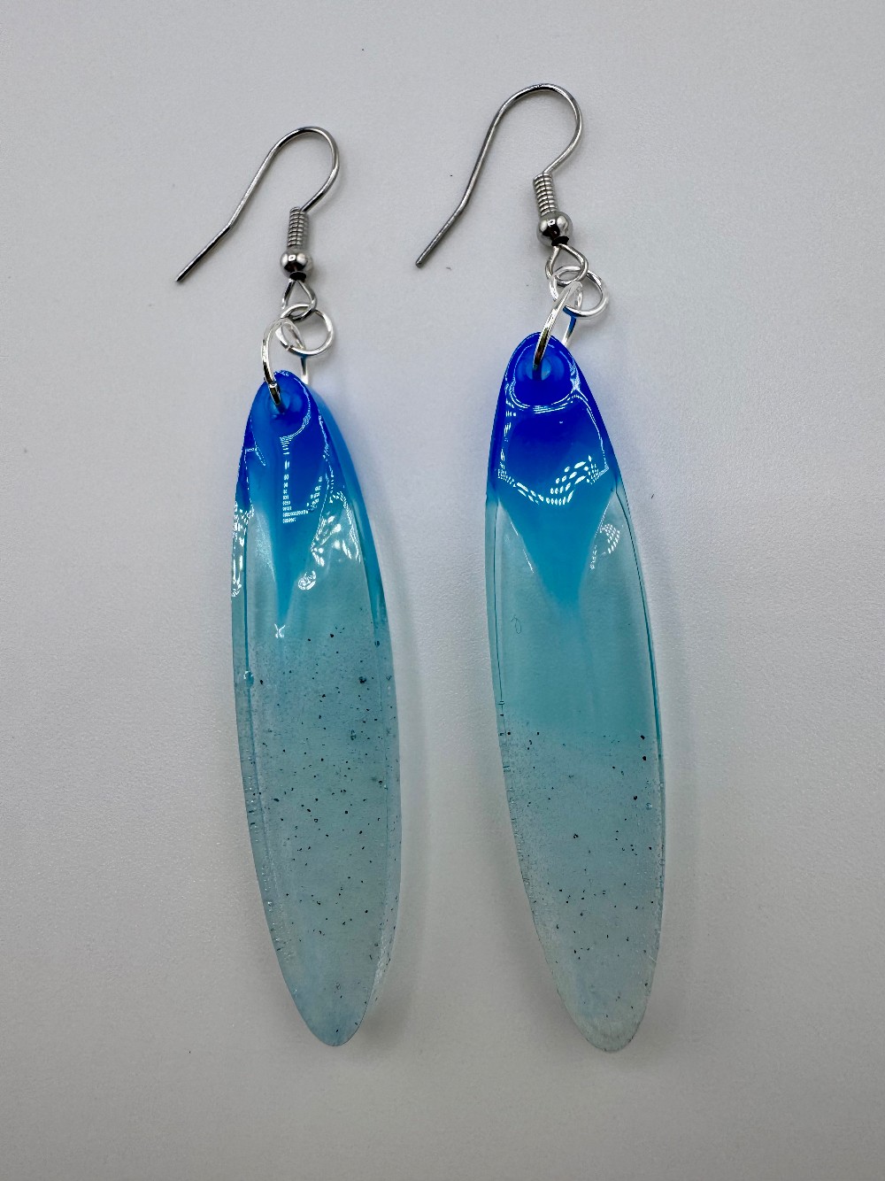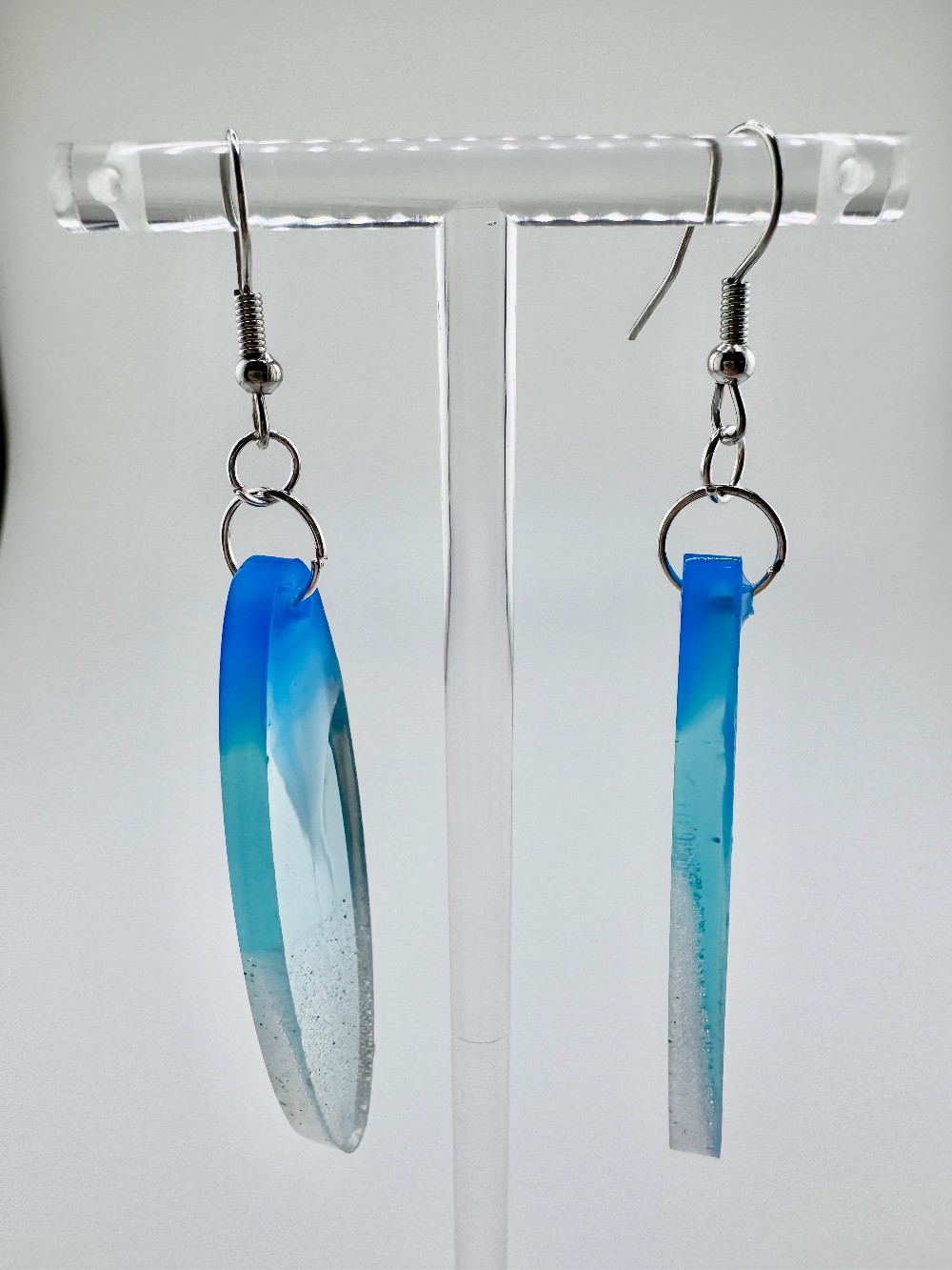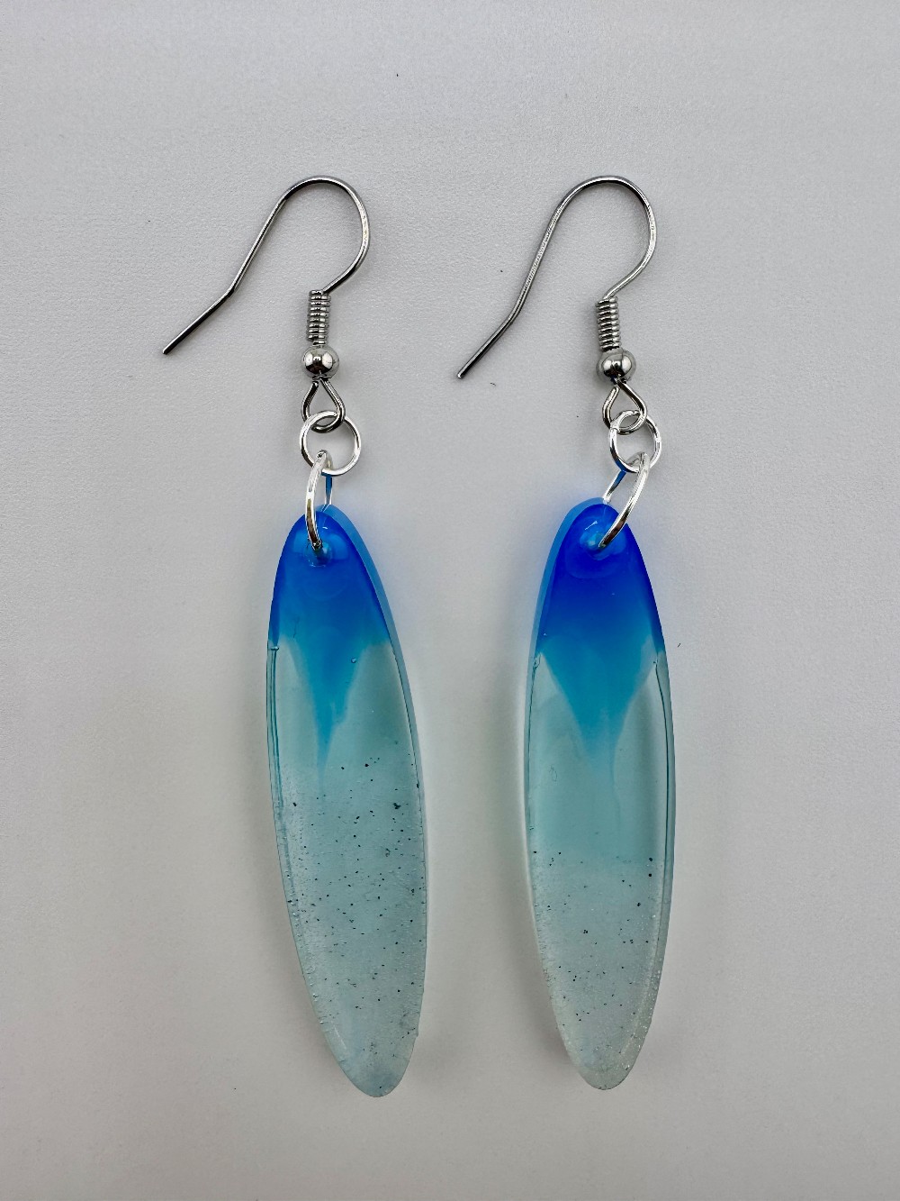 3" x 0.5" surfboard shaped resin shoreline earrings with stainless steel hooks and real AMI sand