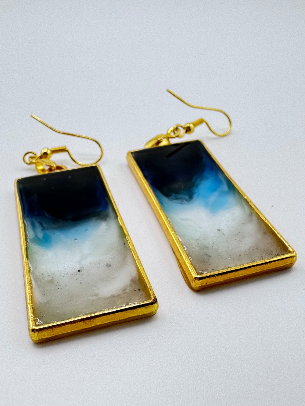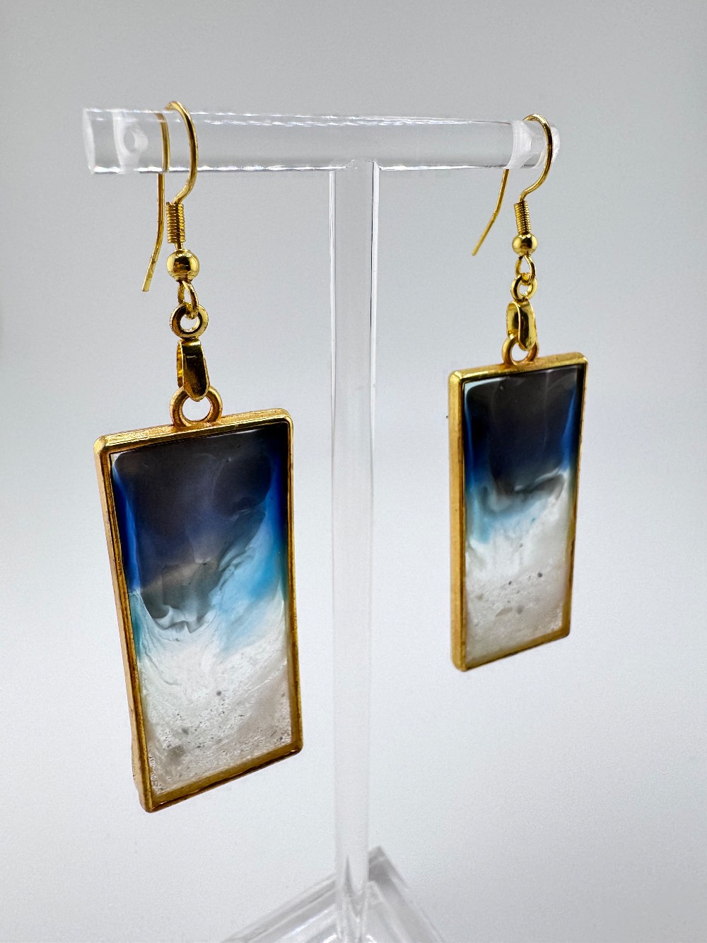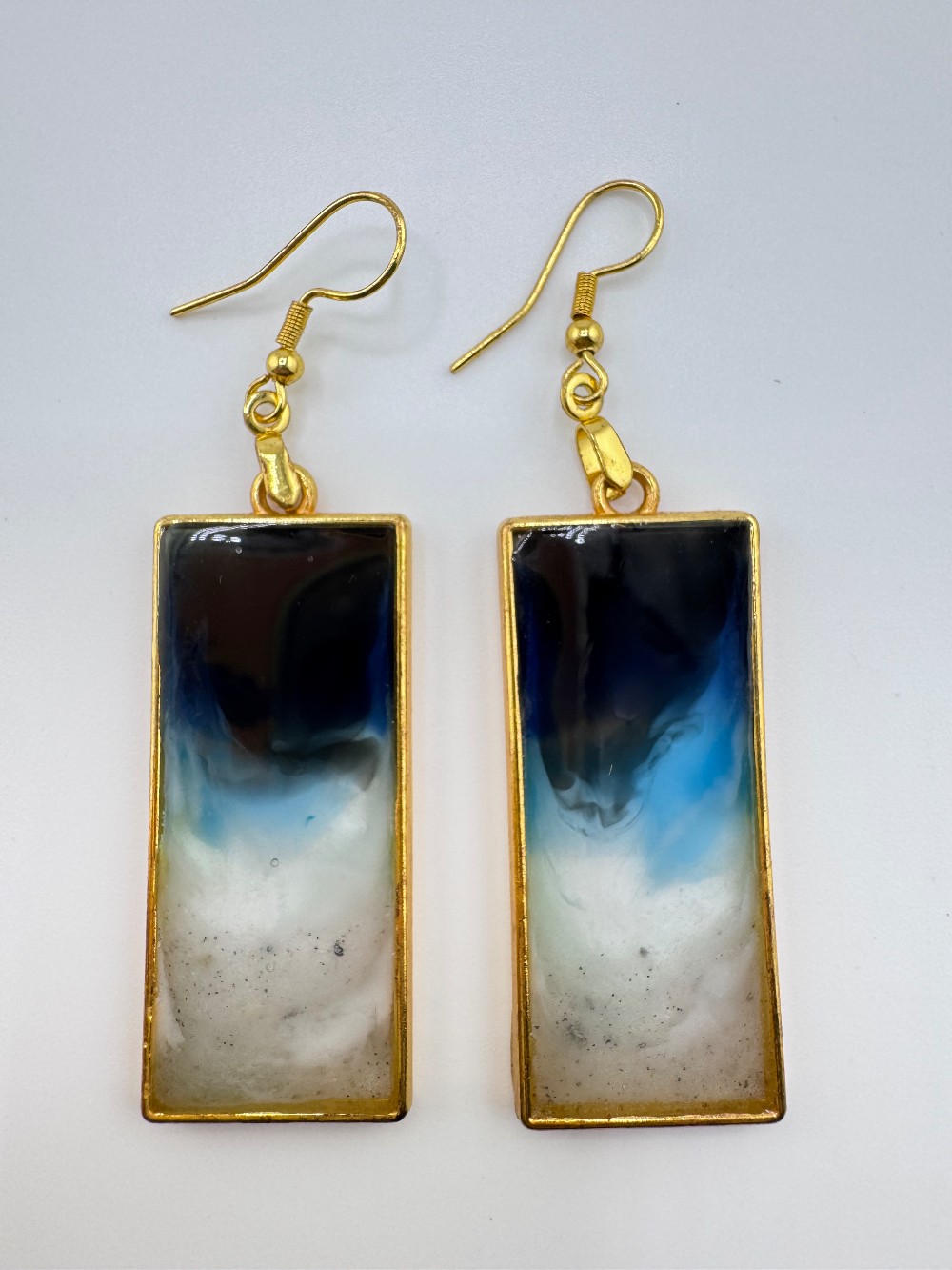 3" x 0.75" rectangle shaped resin shoreline earrings with gold toned bezel and hooks with real AMI sand