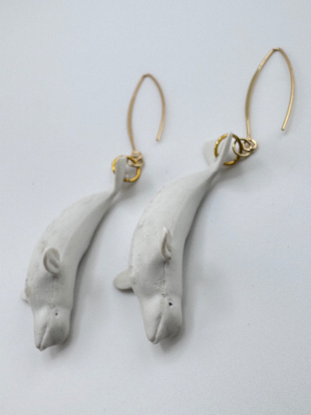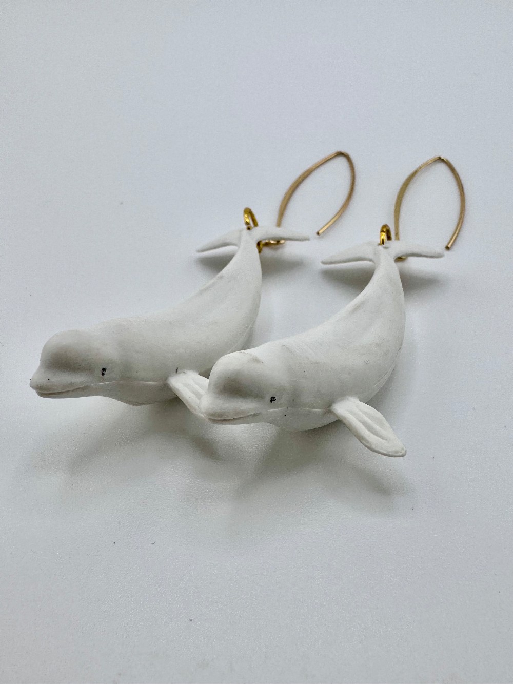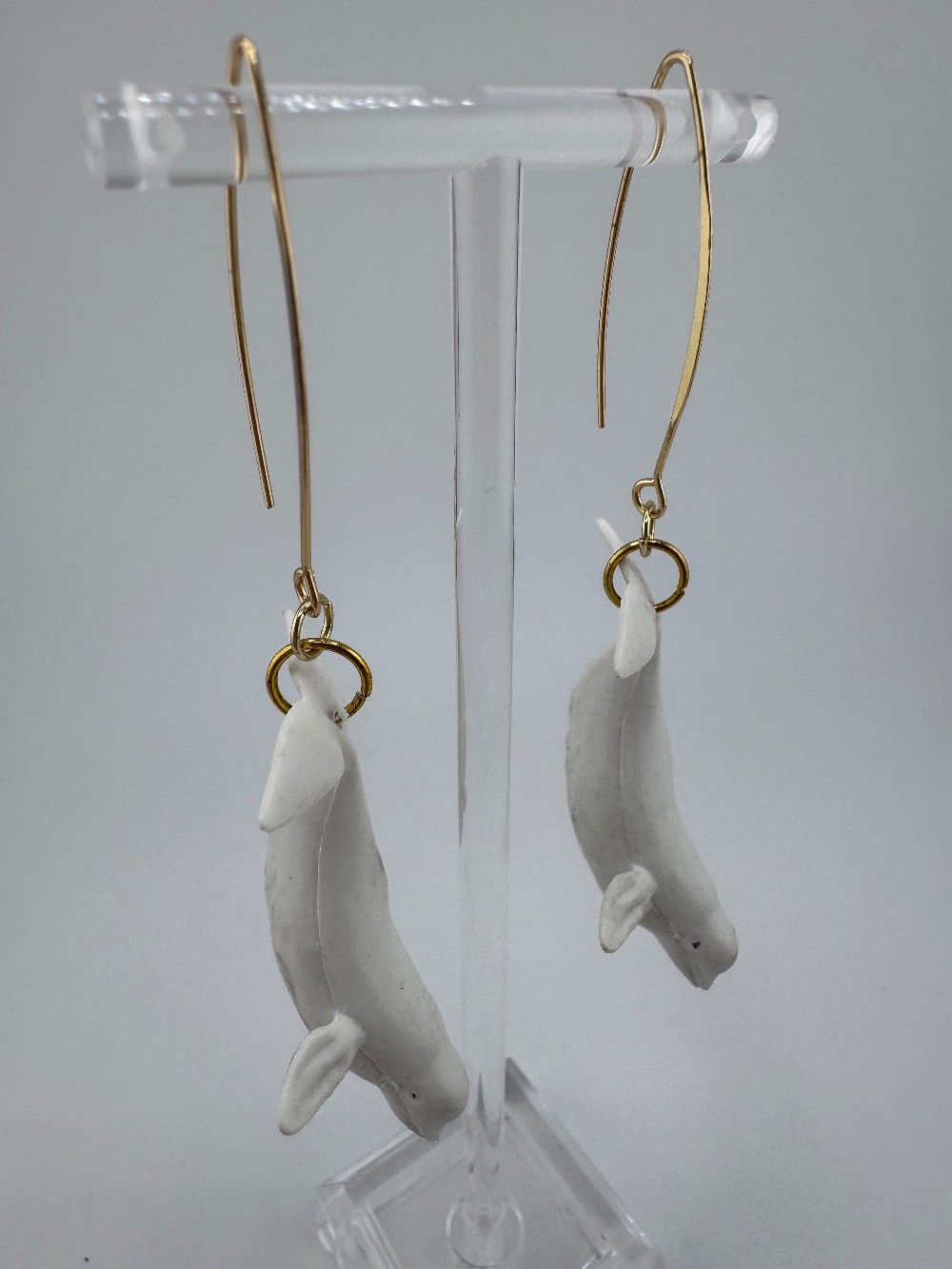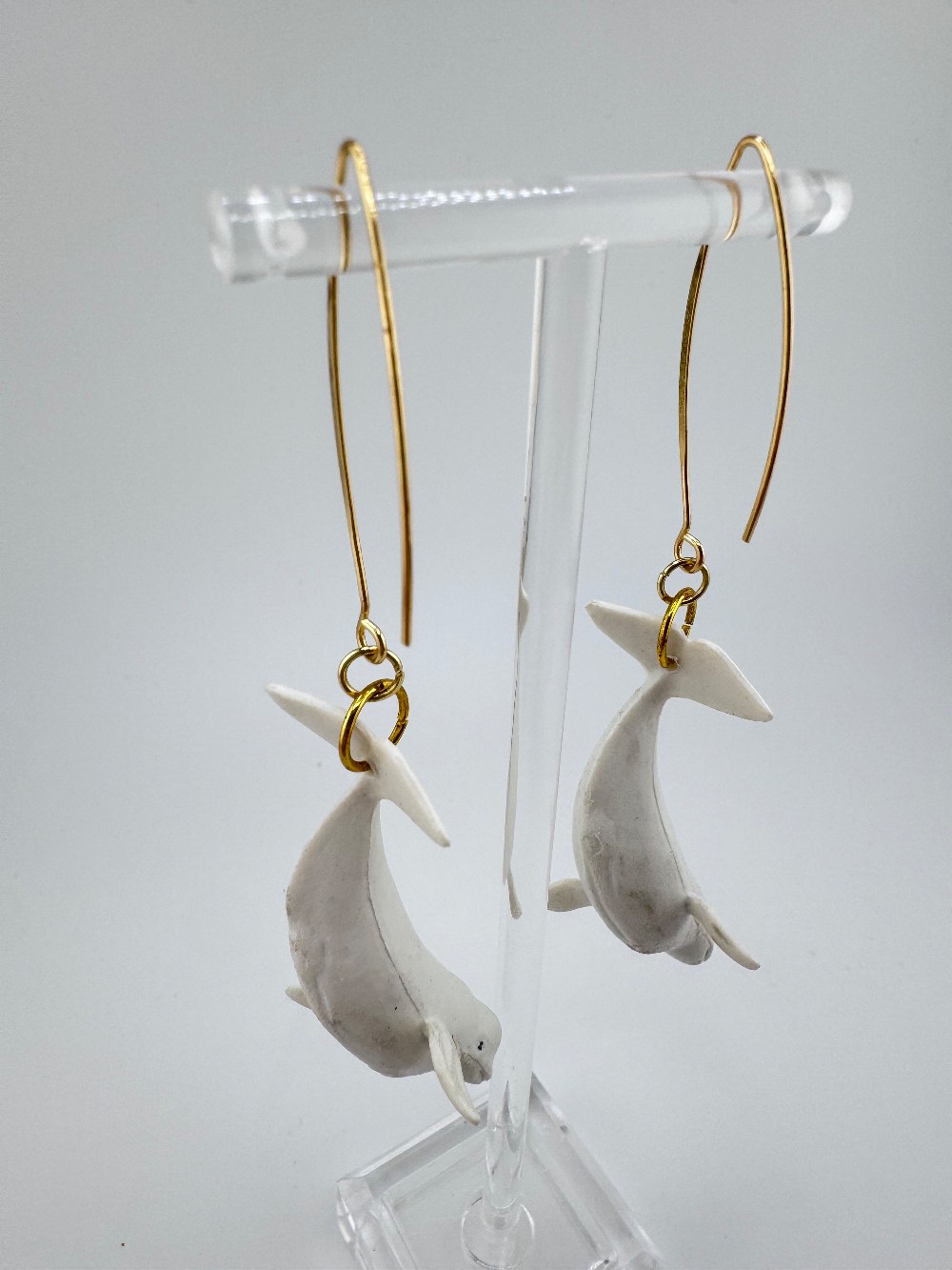 3.5" x 1" plastic beluga whale earrings with gold plated hooks