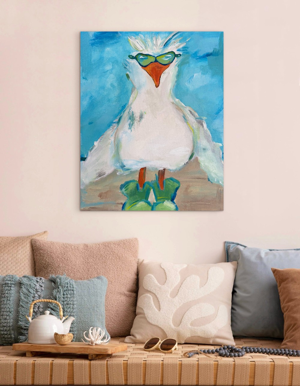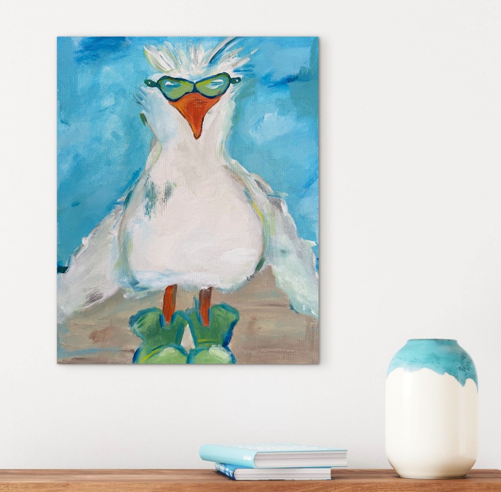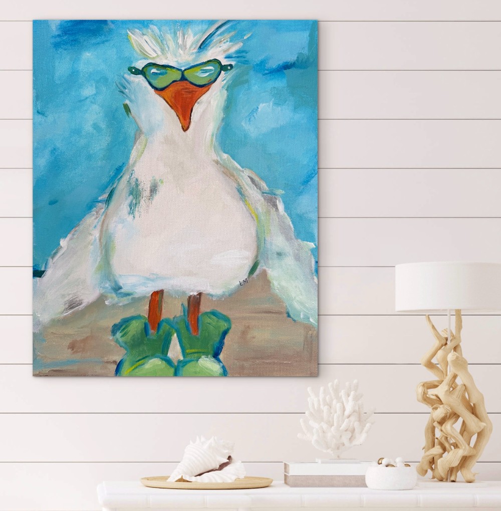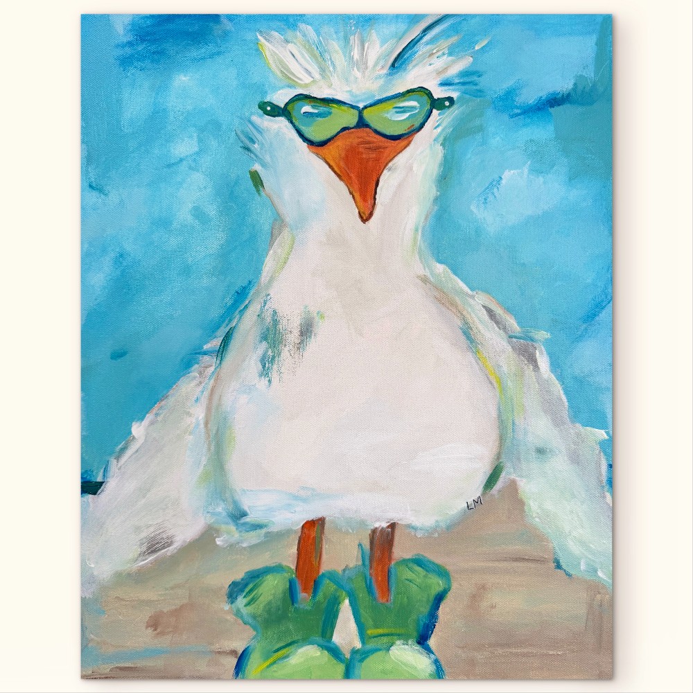 16x20 inch gallery wrapped canvas. Original acrylic painting by Lori McKinnon titled "Sassy Seagull". Initialed on the front, signed on the back with certificate of authenticity included. The sides have been painted to carry over from the front. SEE BELOW REGARDING SHIPPING OPTIONS