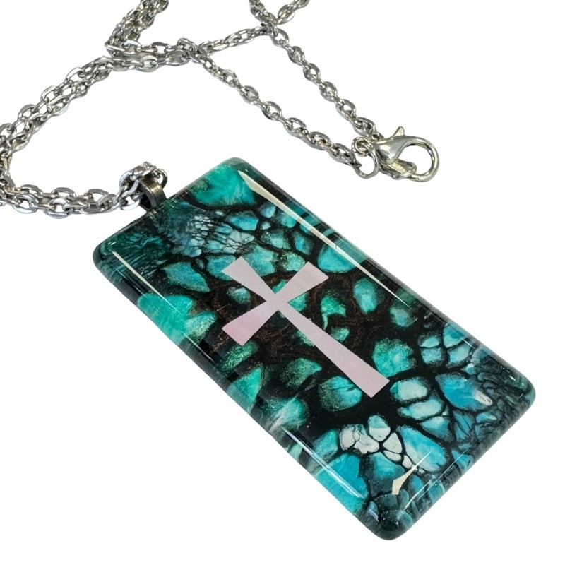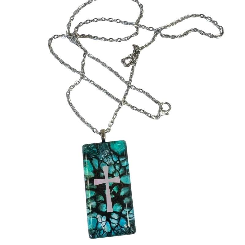 Painted glass pendant with cross embellishment. Stainless steel chain has lobster clasp closure and measures 24 inches long