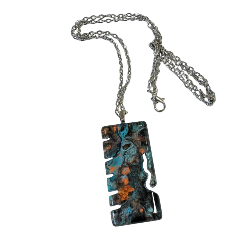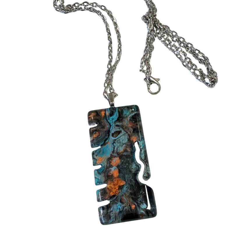 Stainless steel chain with lobster clasp. Pendant created by artist Lori McKinnon and measures 1x2"