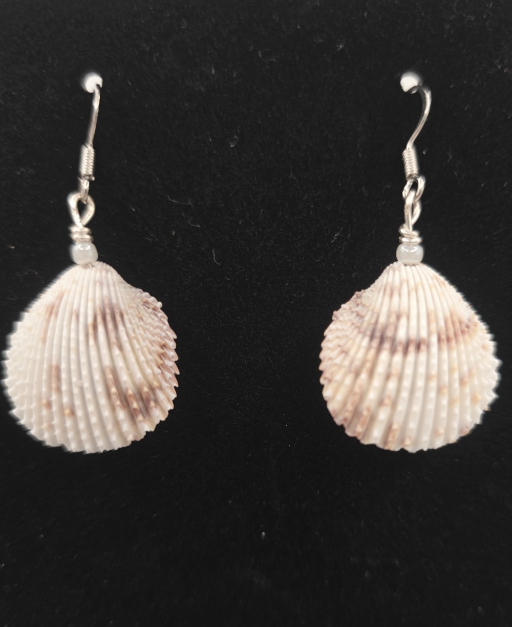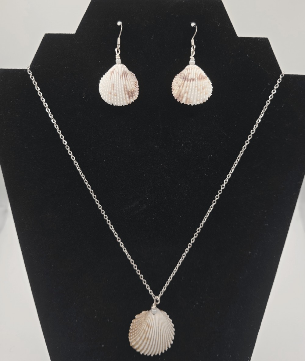Genuine freshwater pearl and Florida cockle shell necklace and earring set in anti tarnish silver stainless steel. Approx 1 inch shells.