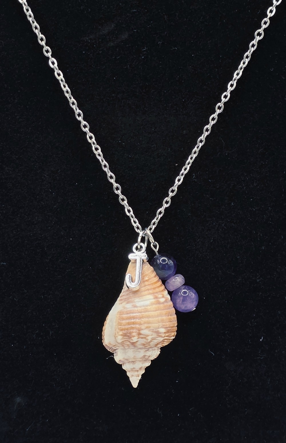 Juvenile conch shell with initial necklace. Shell is treated to maintain its beauty. Amethyst removable charm. Custom orders accepted. 18" stainless silver chain and findings.