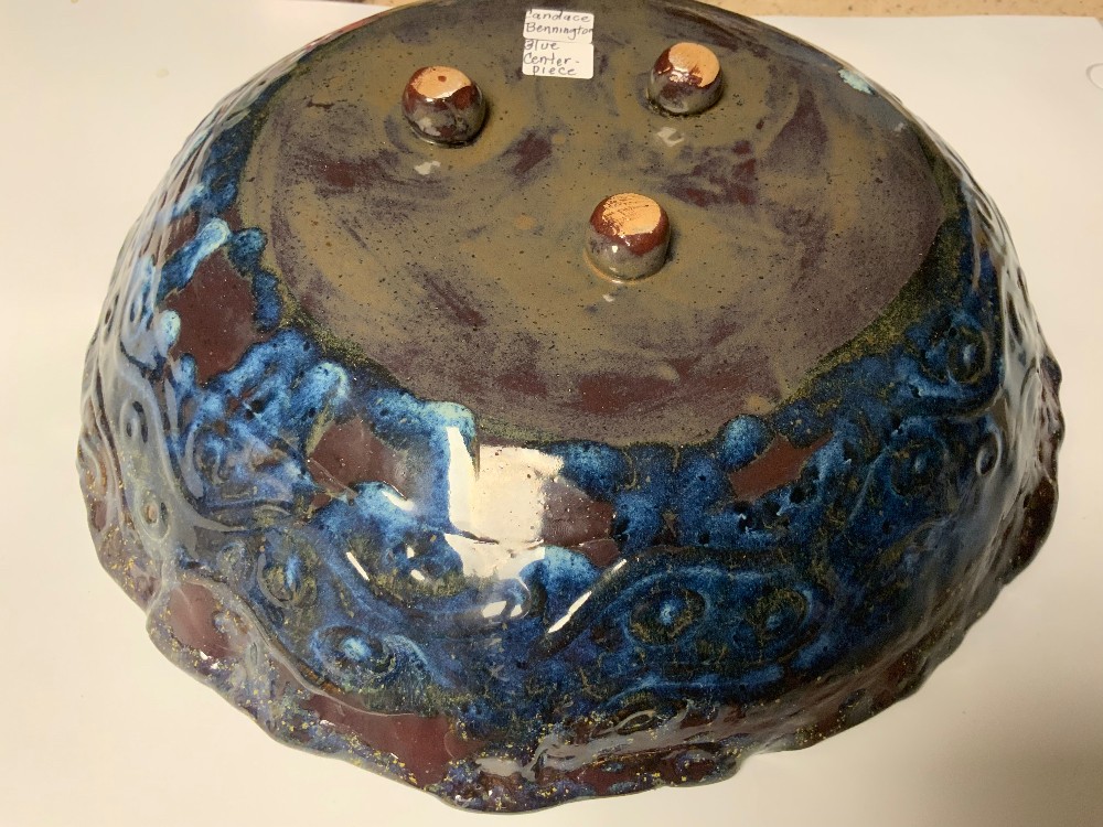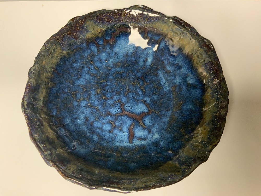 Large blue w/speckled brown edge. Food safe, large 12.5 inches wide x 3.5 inches high