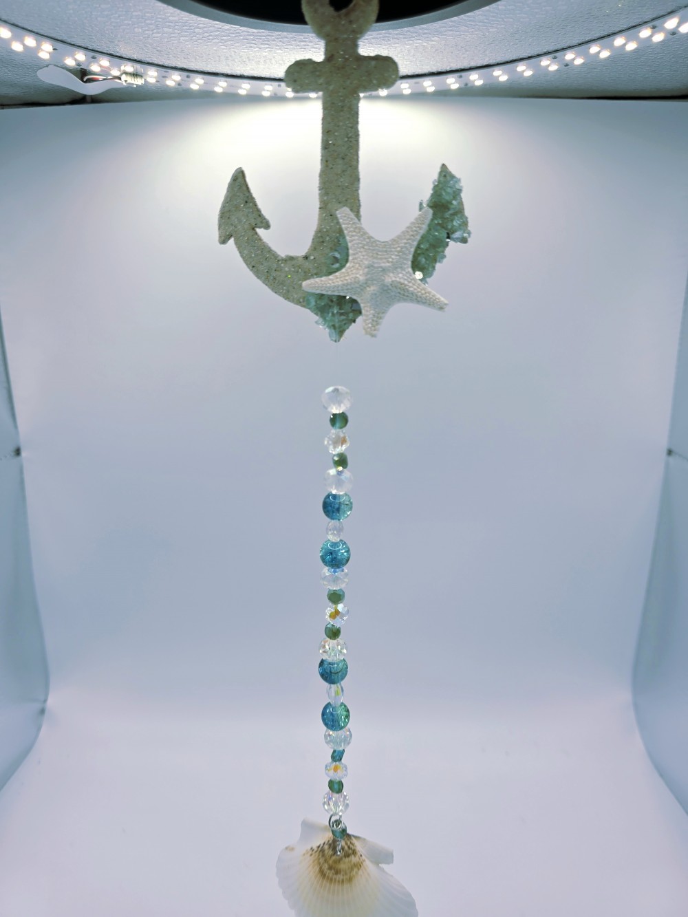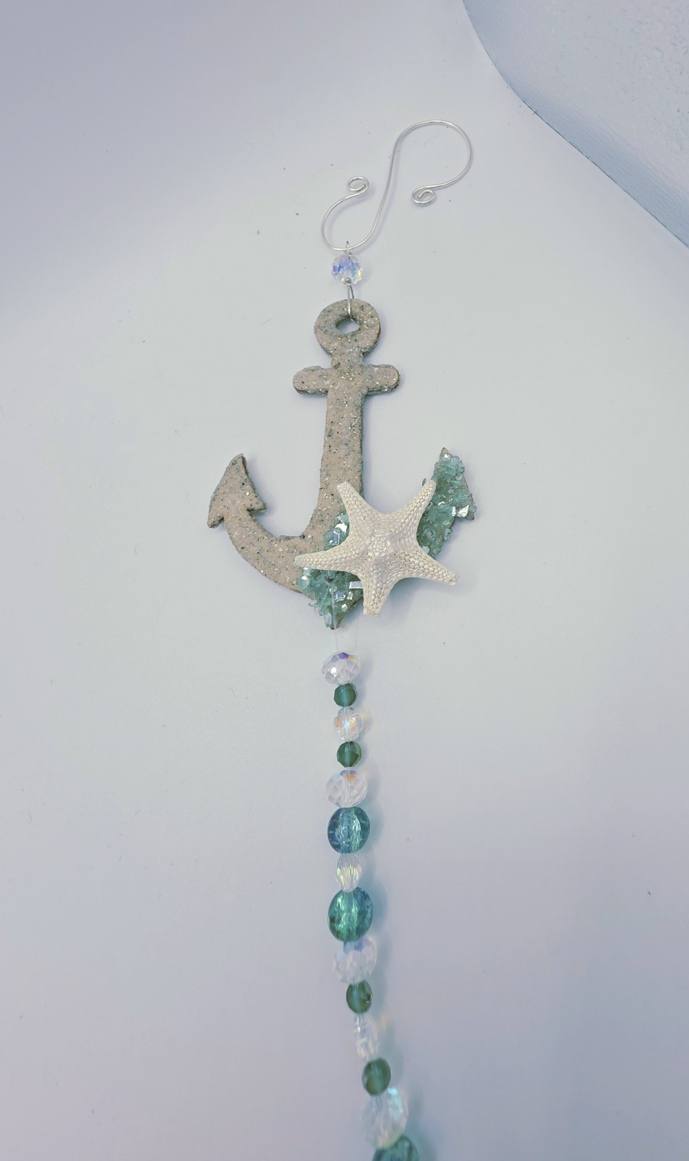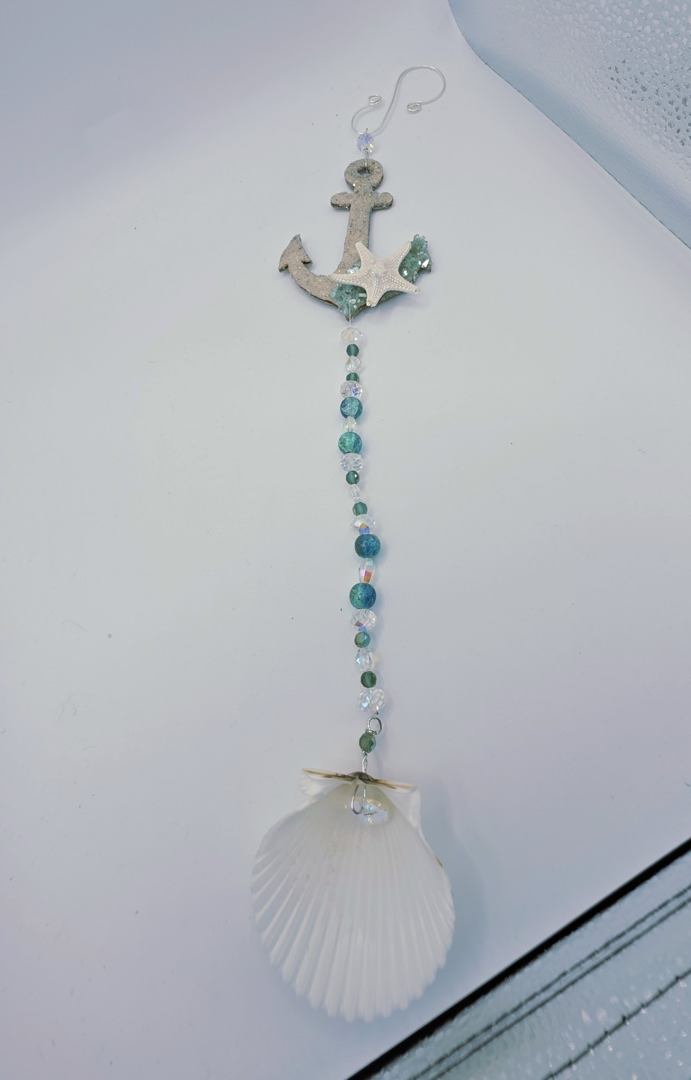 Genuine AMI beach sand and crushed glass anchor ornament suncatcher with turquoise and iridescent glass beads and scallop shell. Anti tarnish silver findings