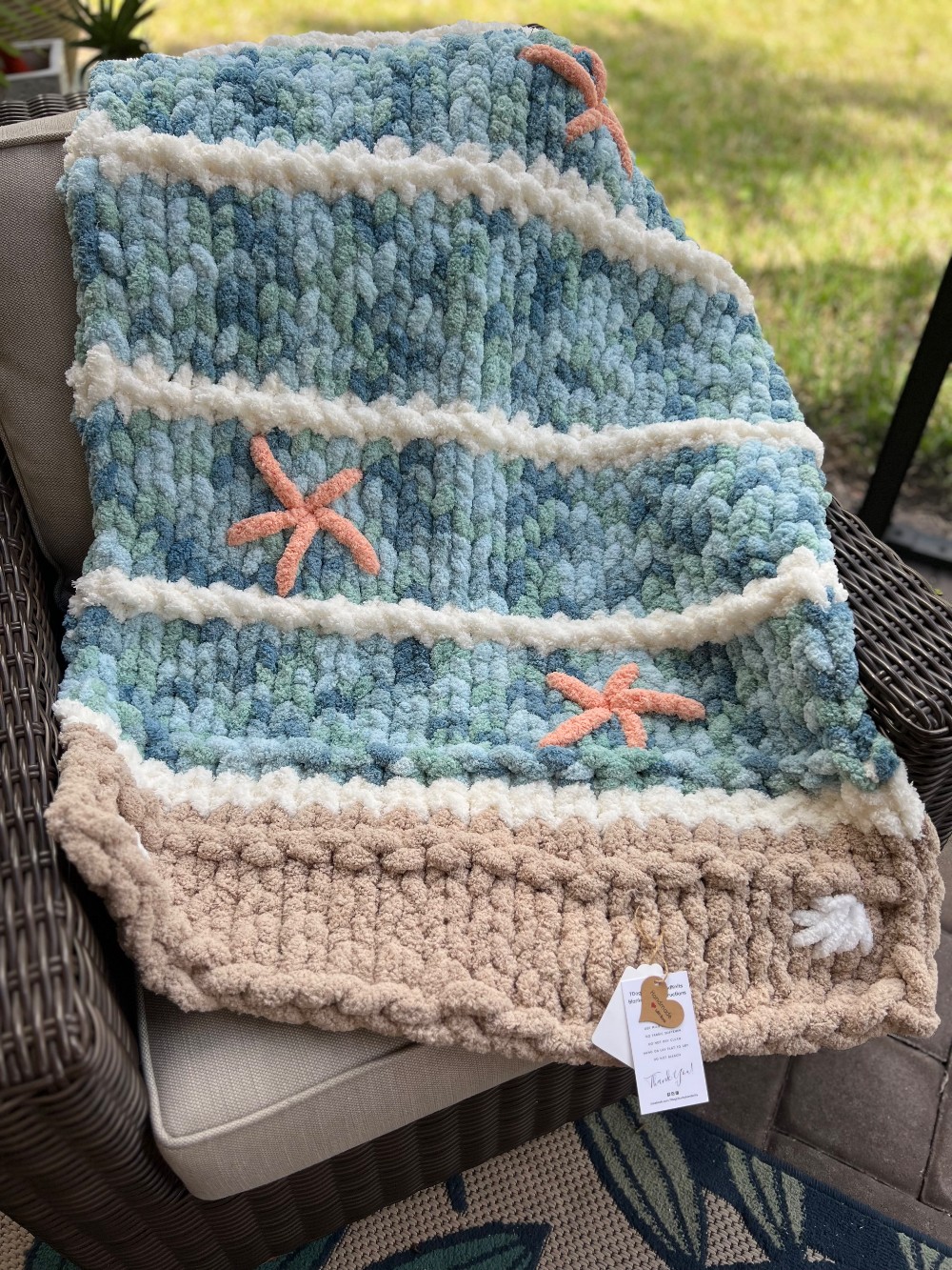 CONTACT US FOR SHIPPING QUOTE OR PICK UP AT SHOP - Bring a little bit of the gulf into your home with the beautiful approximately 30" x 40" lap blanket. The variegated blues will remind you of your most peaceful days sitting by the water, gathering shells and starfish. This lovingly hand made, soft and cozy blanket, is machine washable. Each blanket includes a care instruction card to help you best maintain your legacy blanket.