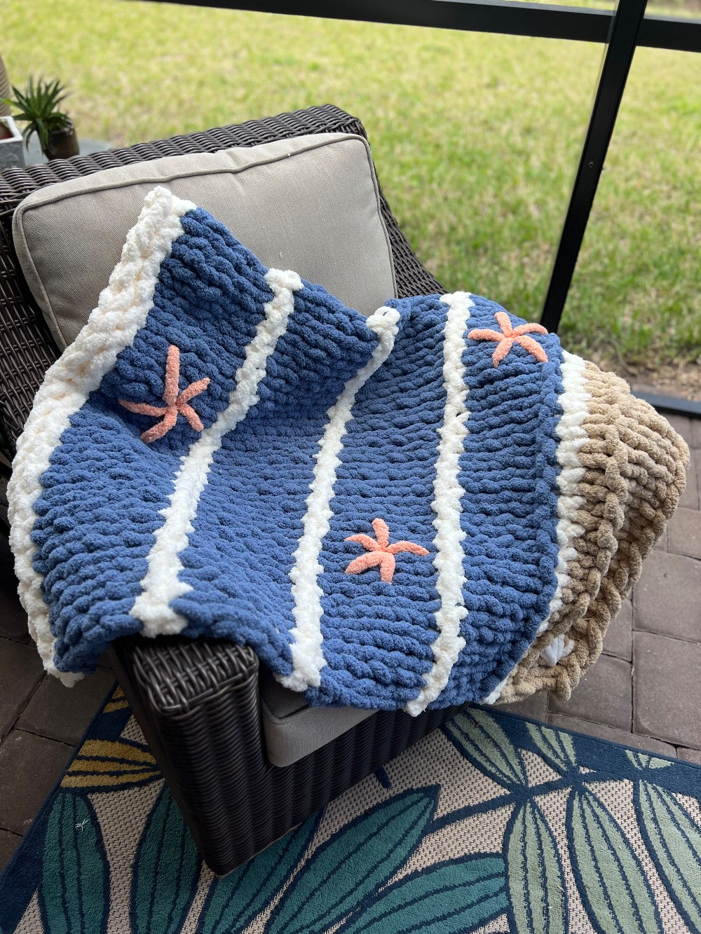 CONTACT US FOR SHIPPING QUOTE OR PICK UP AT SHOP - Bring the feel of the ocean into your home minus the sand! This hand knitted lap blanket measuring approximately 30" x 40" is the color of the deepest oceans and even has starfish and shells. Perfect for chilly evenings on your golf cart, relaxing or as a decorative piece to remind you of happy days by the shore. Machine washable and comes with a care instructions card