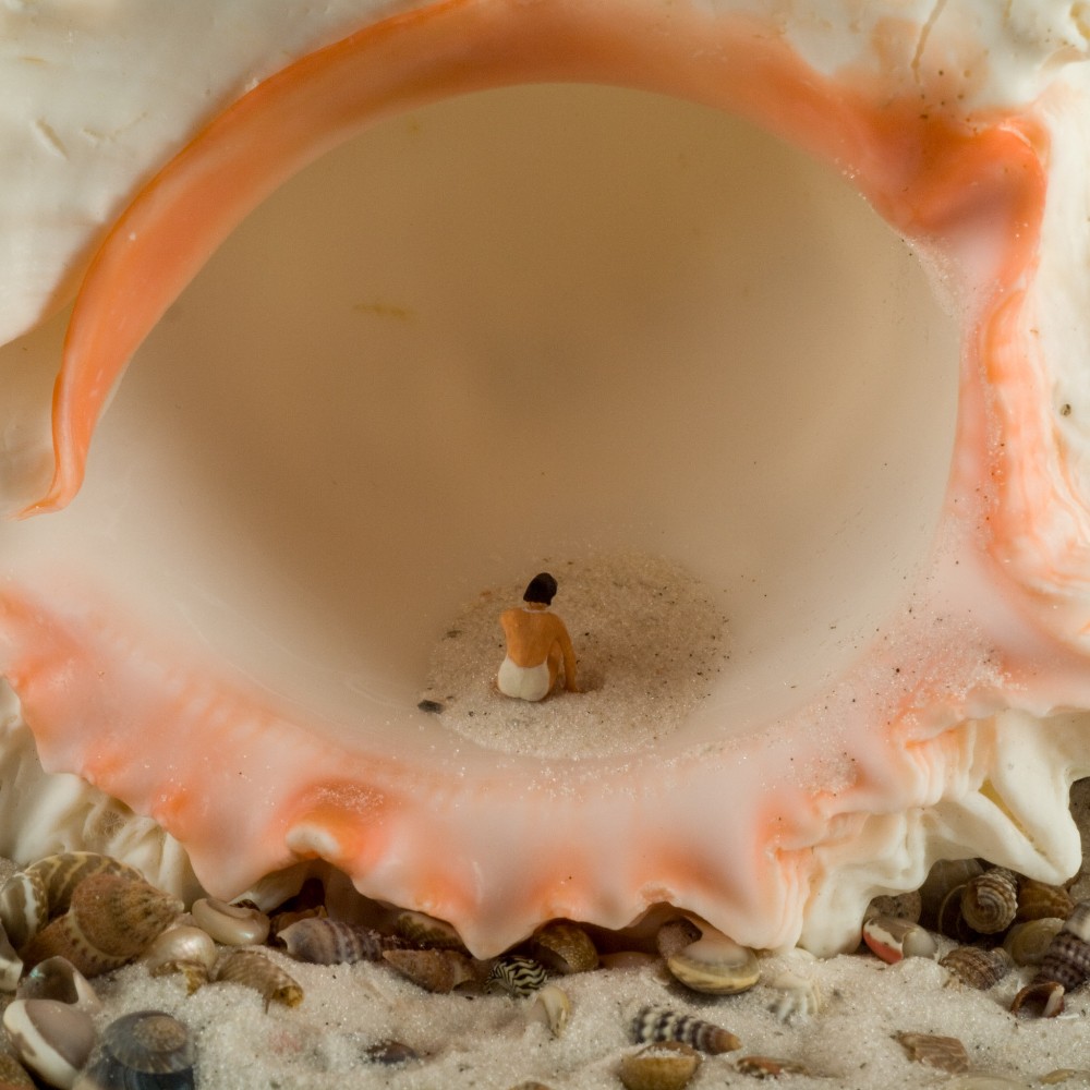 Real photo of beach scene with miniature figurines. 8x8". Can be framed without mat or glass..